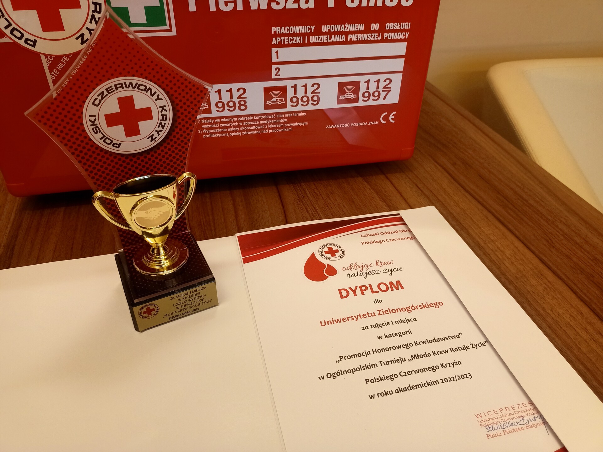 Rektor Uniwersytetu Zielonogórskiego - prof. dr hab. Wojciech Strzyżewski odbiera nagrodę dla Uniwersytetu Zielonogórskiego, wręcza ją Marszałek Województwa Lubuskiego - Elżbieta Anna Polak; fot. Urząd Marszałkowski Województwa Lubuskiego